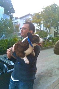 Details: We saw this girl motoring through a busy intersection with no regard for her personal well-being. I bolted after her while my wife found the owner. (He was the guy yelling, “I’m sixty-nine years old. I can’t run fast!” Apparently the dog had just arrived in town a few hours before: she was a ‘retired’ breeder dog from Arkansas and had never been off the farm. Cars and traffic were totally foreign to her. Thus her total obliviousness to the rules of the road.) The entire chase was under 10 minutes, but may I remind you that San Francisco is hilly? Especially Noe Valley, where the streets have sidestairs, not sidewalks. Wrangling her was a team effort: at intersections, drivers would point which way the dog headed.