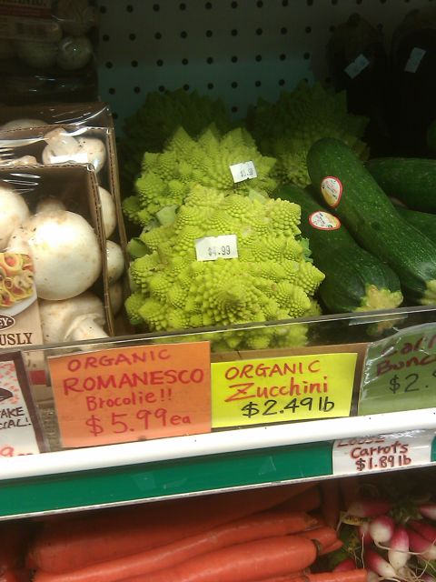 Contrary to the name, Romanesco broccoli is actually a cauliflower. It’s notable because it’s mildly fractal-like. Note the anti-establishment spelling and pricing schemes.